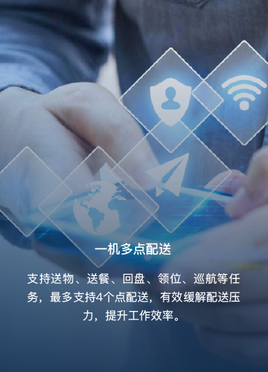 支持送物、送餐、回盘、领位、巡航等任务,最多支持4个点配送,有效缓解配送压力,提升工作效率。